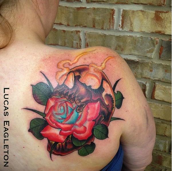 Lucas Eagleton Tattoos Nature Fire Skull With Rose And Flames